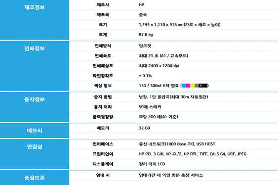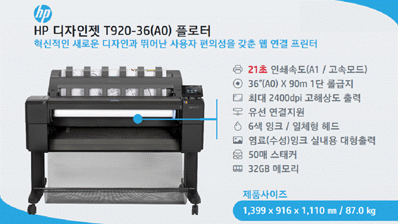 오늘 A/S 할 의정부 설계도면업체의 HP T920플로터 36인치(A0용지크기) 플로터의 스펙은