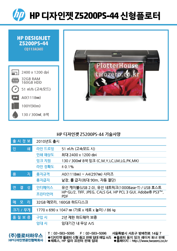 오늘 설치한 HP DSJ Z5200-44 모델의 스펙입니다.