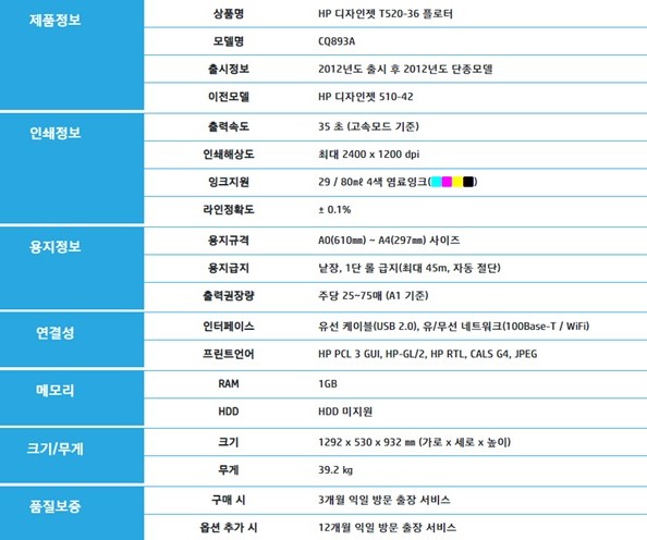 오늘 A/S 할 HP T520플로터 36인치(A0용지크기) 플로터의 스펙은