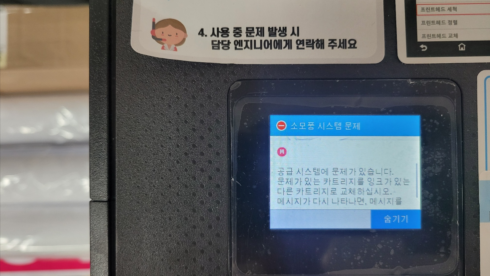소모품 시스템 문제라는 에러가 떠 있는데요무한장비를 쓰시는 경우에 잉크교환을 늦게 하시면 노즐에 공기가 차서 이러한 에러가 뜨는 경우와잉크 카트리지가 고장 난 경우가 있습니다.
